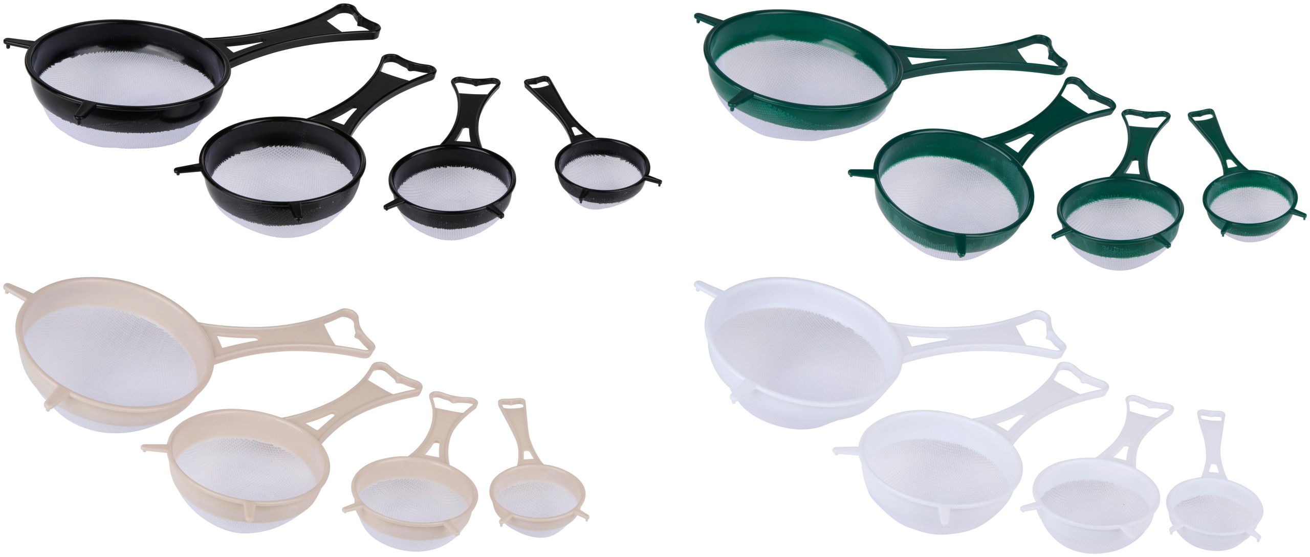 Handige keukenzeef in vier maten, ideaal voor het zeven van bloem, suiker of andere ingrediënten in de keuken.