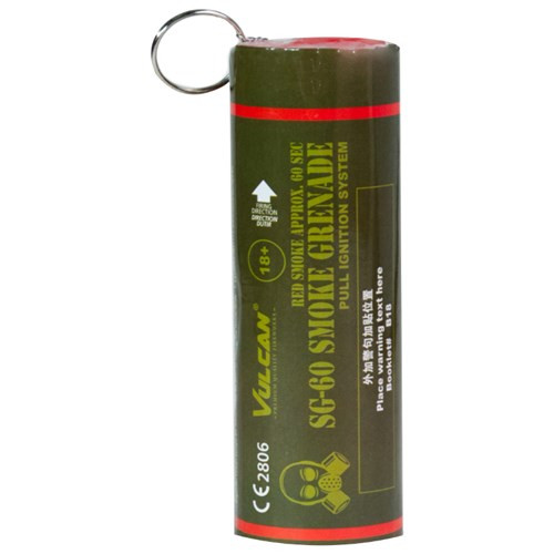 Ontdek de Smoke Grenade ROOD met trekdraad, die aan 1 kant 60 seconden levendige rode rook afgeeft.