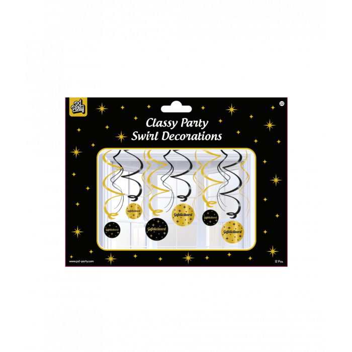 Een luxe feestje kan niet zonder deze black/gold classy party swirls. Deze unieke zwart gouden swirls zijn gemaakt van plastic en papier en zijn ongeveer 70 centimeter lang. De besteleenheid is 6 en om het feestje af te maken kunt u er de classy party balloons, hanging decorations en flag banners er direct bij bestellen!